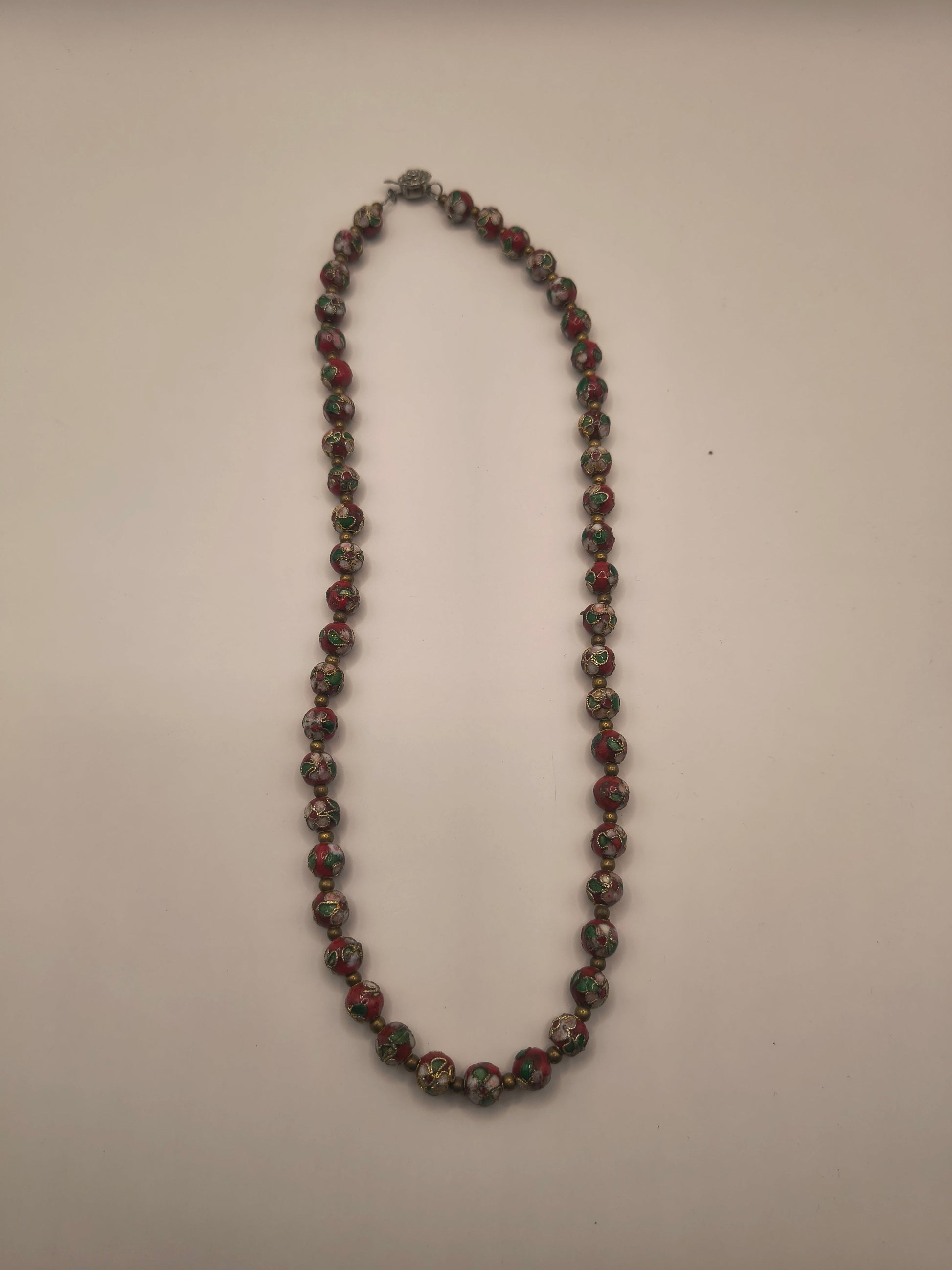 This stunning red cloisonné necklace features intricately handcrafted beads adorned with vibrant floral designs in pink, green, and gold. A timeless piece of artistry, it is lightweight and comfortable, making it perfect for any occasion, whether you're dressing up for an event or adding a unique flair to your everyday wardrobe. Add this elegant statement piece to your collection.