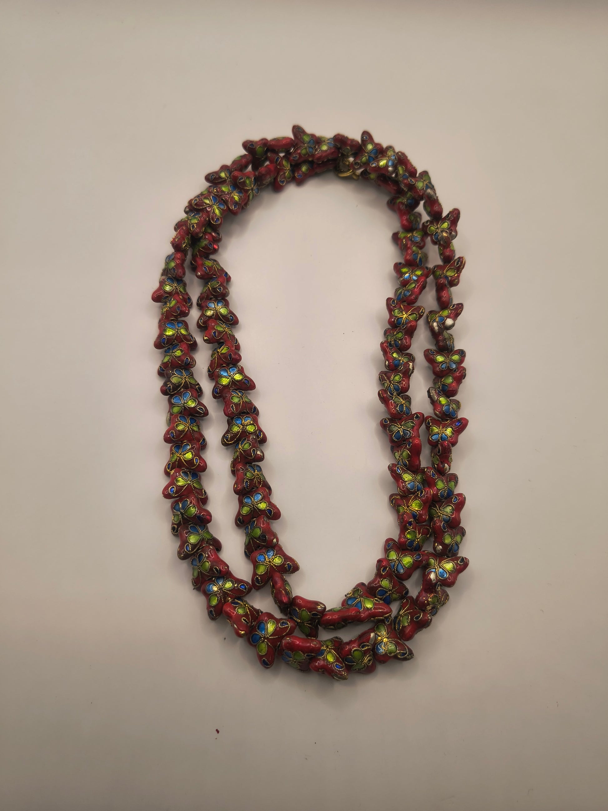 This stunning white cloisonné necklace features intricately handcrafted butterfly beads adorned with vibrant colours in blue, green, and gold. A timeless piece of artistry, it is lightweight and comfortable, making it perfect for any occasion, whether you're dressing up for an event or adding a unique flair to your everyday wardrobe. Add this elegant statement piece to your collection.