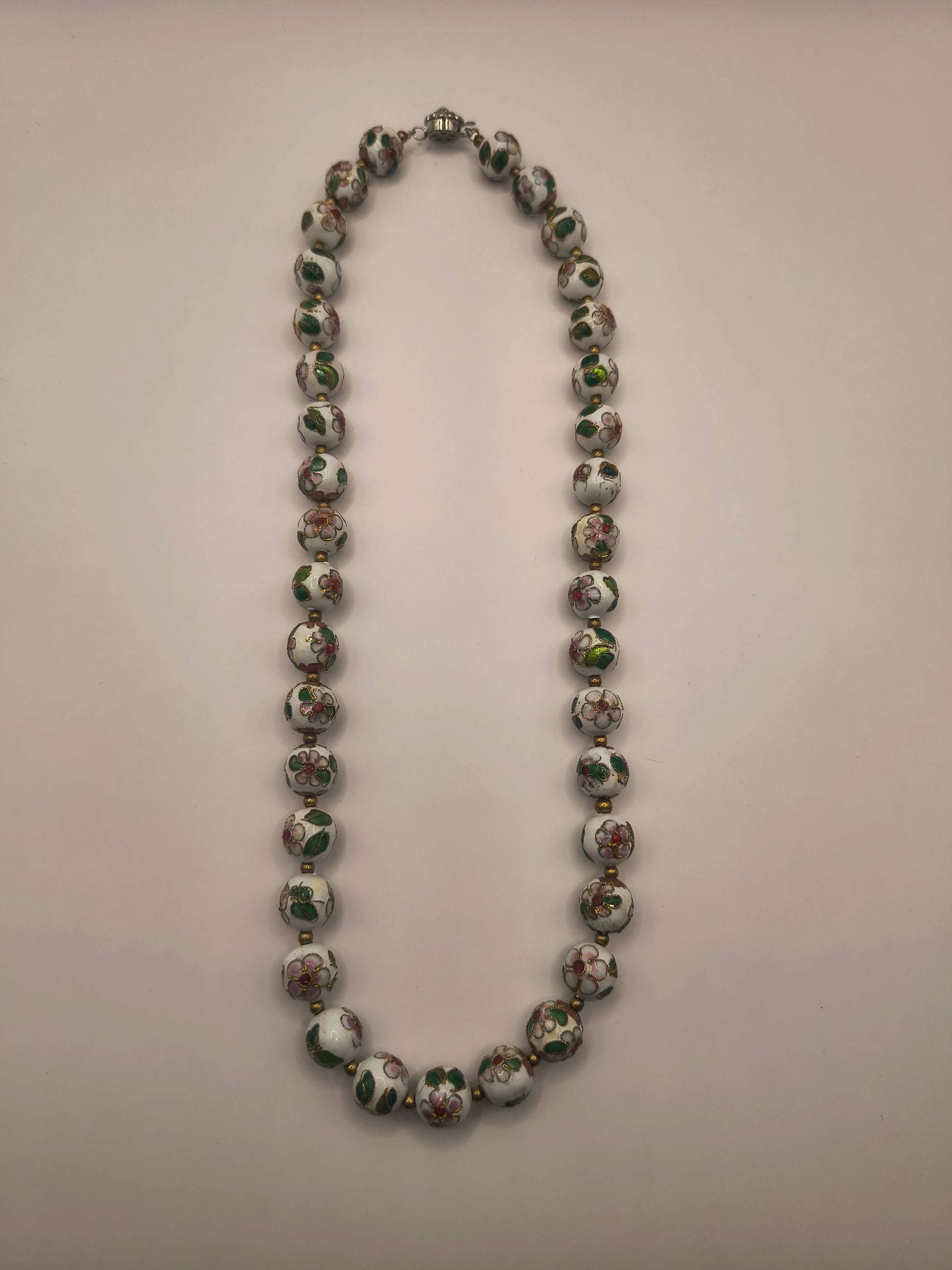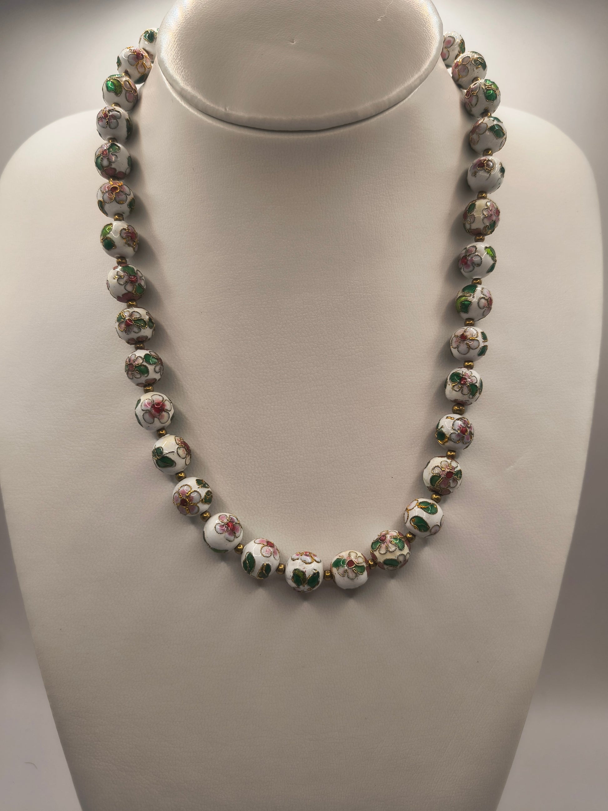This stunning white cloisonné necklace features intricately handcrafted beads adorned with vibrant floral designs in pink, green, and gold. A timeless piece of artistry, it is lightweight and comfortable, making it perfect for any occasion, whether you're dressing up for an event or adding a unique flair to your everyday wardrobe. Add this elegant statement piece to your collection.